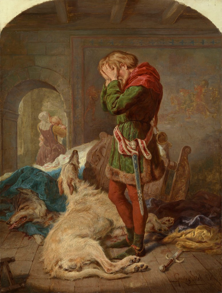 LLywelyn (1173-1240) and his Brave Hound, Gelert, Published January 23, 2025 at 1249 × 1650 in LLywelyn (1173-1240) and his Brave Hound, Gelert, LLywelyn (1173-1240) and his Brave Hound, Gelert, by Gourlay Steell. 1880. Oil on canvas. 81.6 x 61.3 cm. Royal Collection RCIN 403634. {PD-US} Fair Use. Scotland.